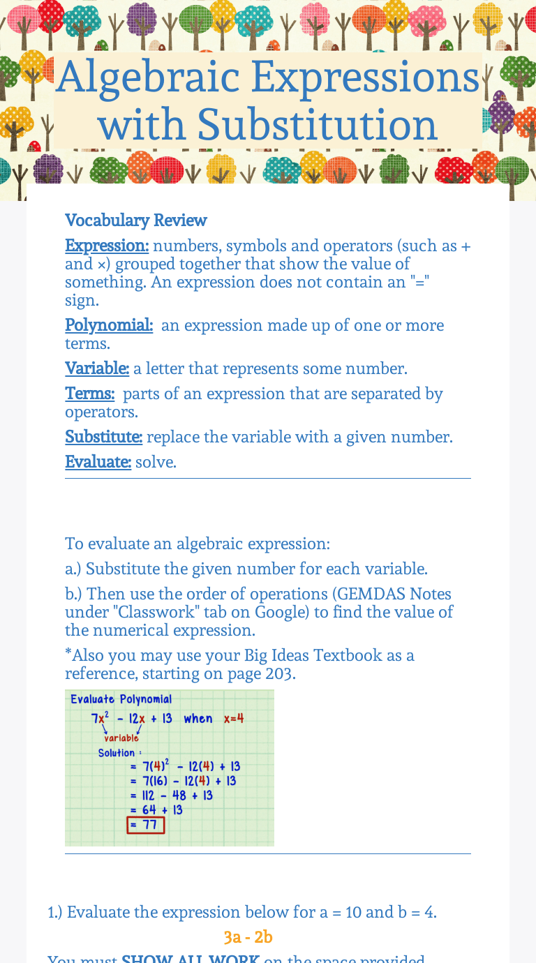 Interpret parts of an expression, such as terms, factors, and coefficients. Distribute to students "naming parts of expressions" worksheet. I will complete the first . Then they will practice identifying and labeling parts of an expression using their . Swbat identify the parts of an algebraic expression.